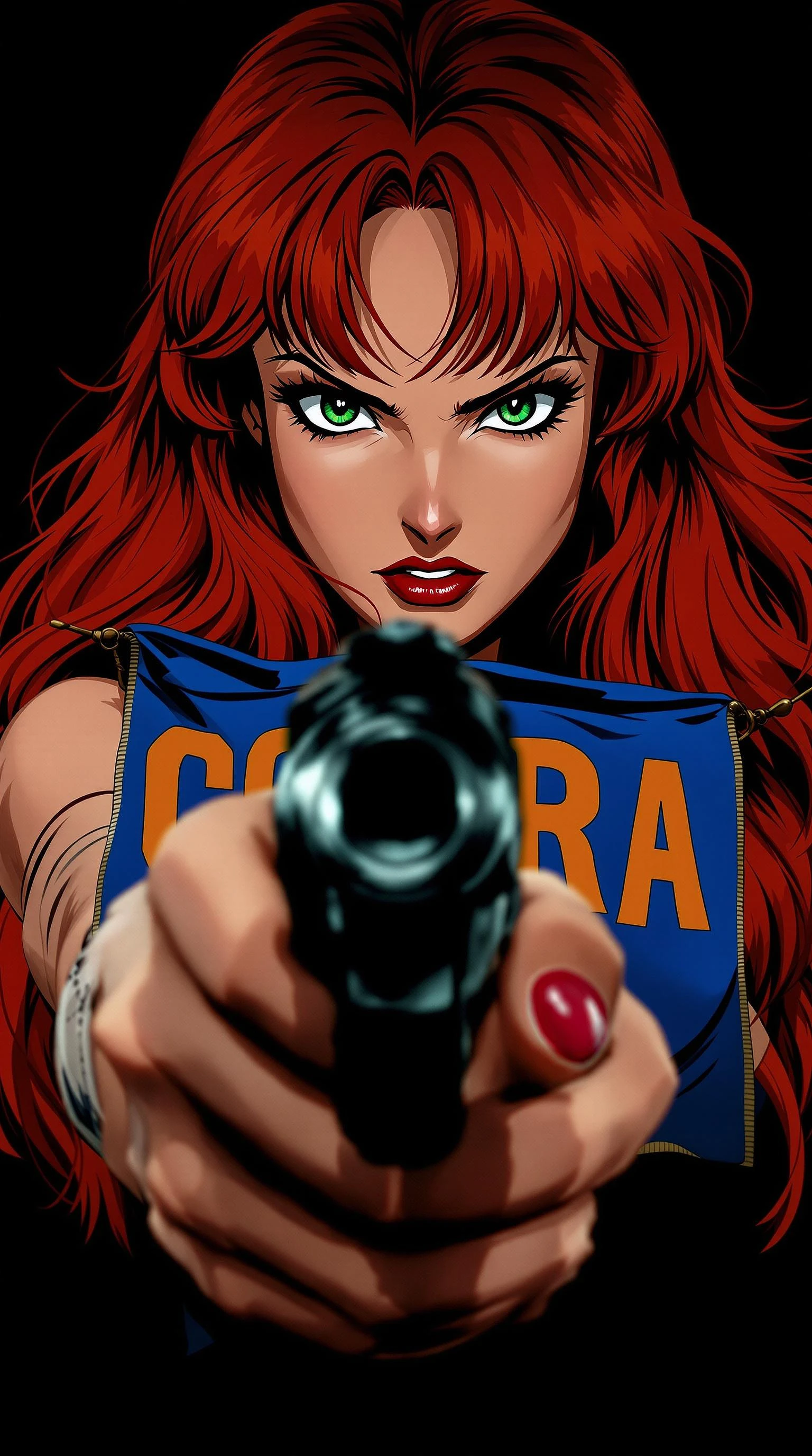 A close-up of a beautiful red head woman with long hair and piercing green eyes in the style of 1980s anime, holding a handgun in her right hand and aiming directly at the viewer. Her expression is serious and intense, with her mouth slightly open as if she's about to speak. The dark background contrasts with a bold blue banner behind her, emblazoned with the word 'COBRA' in striking letters. The overall tone is tense, ominous, and reminiscent of retro anime, with a hint of parody.
