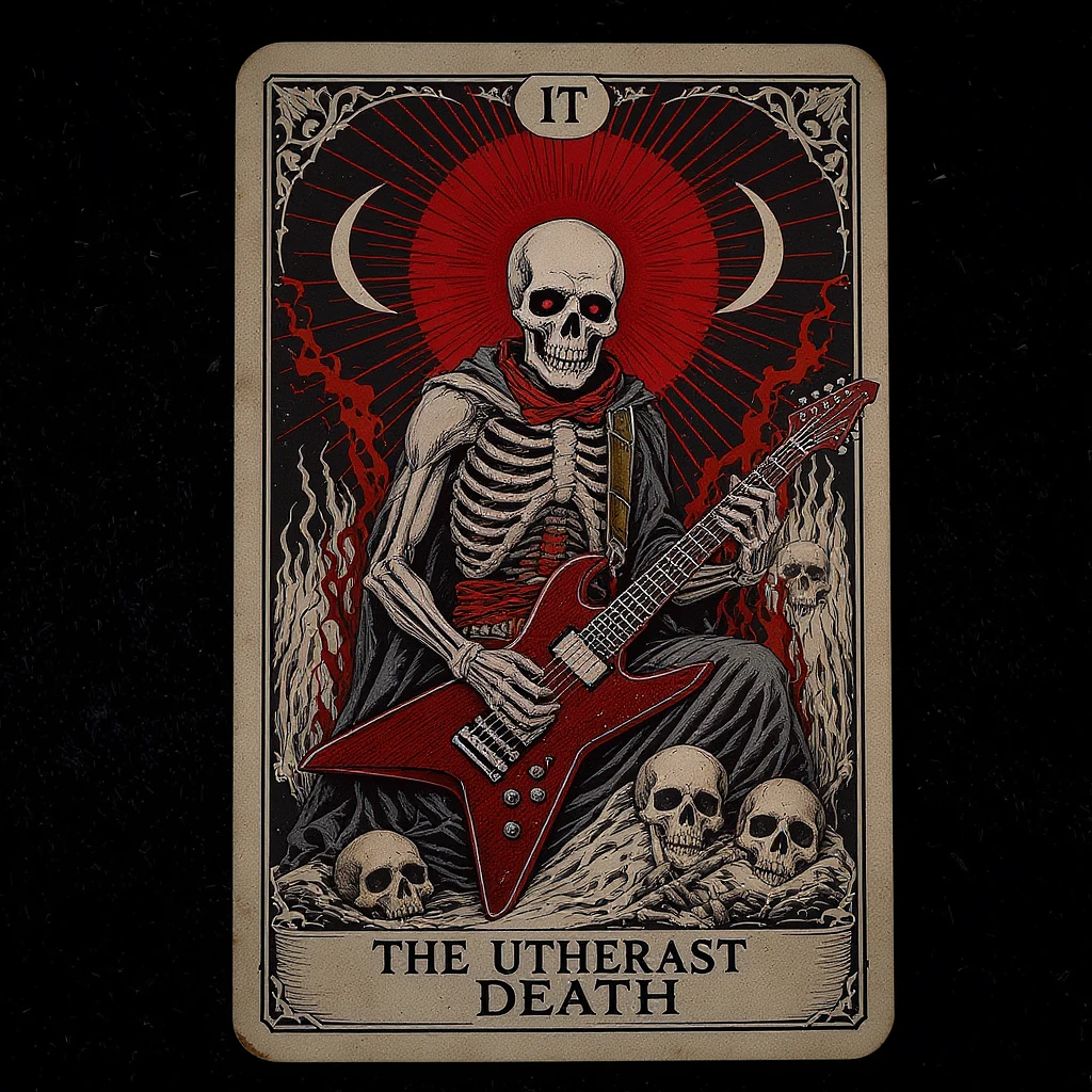 HIGH RESOLUTION REALISTIC IMAGE OF A MODERNIZED DEATH TAROT CARD FOR A ROCK BAND ALBUM COVER. INCLUDE A GUITAR , DRUMS AND SKULLS