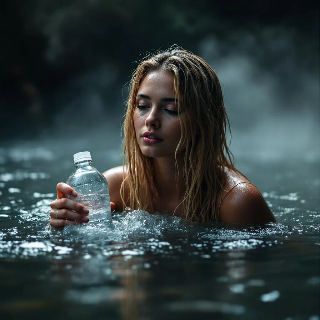 hot spring in a river flow, steam rises from the water, a woman with long wet blonde hair swims in the water, holding a transparent 600ml water bottle in her hand. The image quality is grainy, with a slight blur softening the details. The lighting is dim, casting shadows that obscure her features.