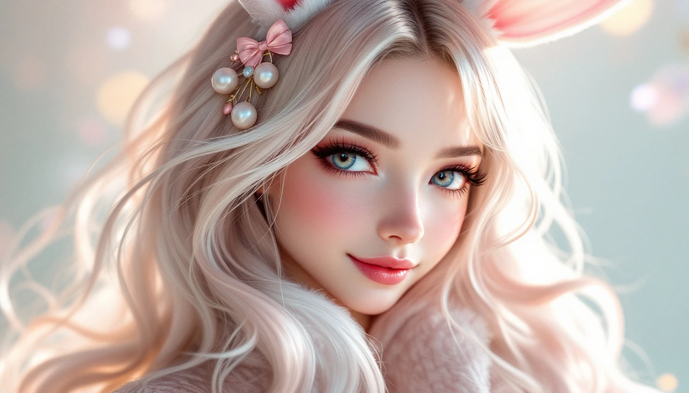 Create an enchanting hybrid character with the delicate, soft features of a bunny and the confident allure of a stylish woman. She has silky, pastel-colored hair flowing in gentle waves, accented with subtle bunny ear accessories that blend seamlessly into her hairstyle. Her eyes are large, expressive, and bright, radiating curiosity and warmth. She has smooth, glowing skin and a slender, graceful figure dressed in elegant, modern attire that complements her charming personality. Her pose exudes confidence and playfulness, with a gentle smile that invites friendliness. Overall, her appearance balances adorable charm with sophisticated allure, creating a captivating, non-nsfw fantasy character.