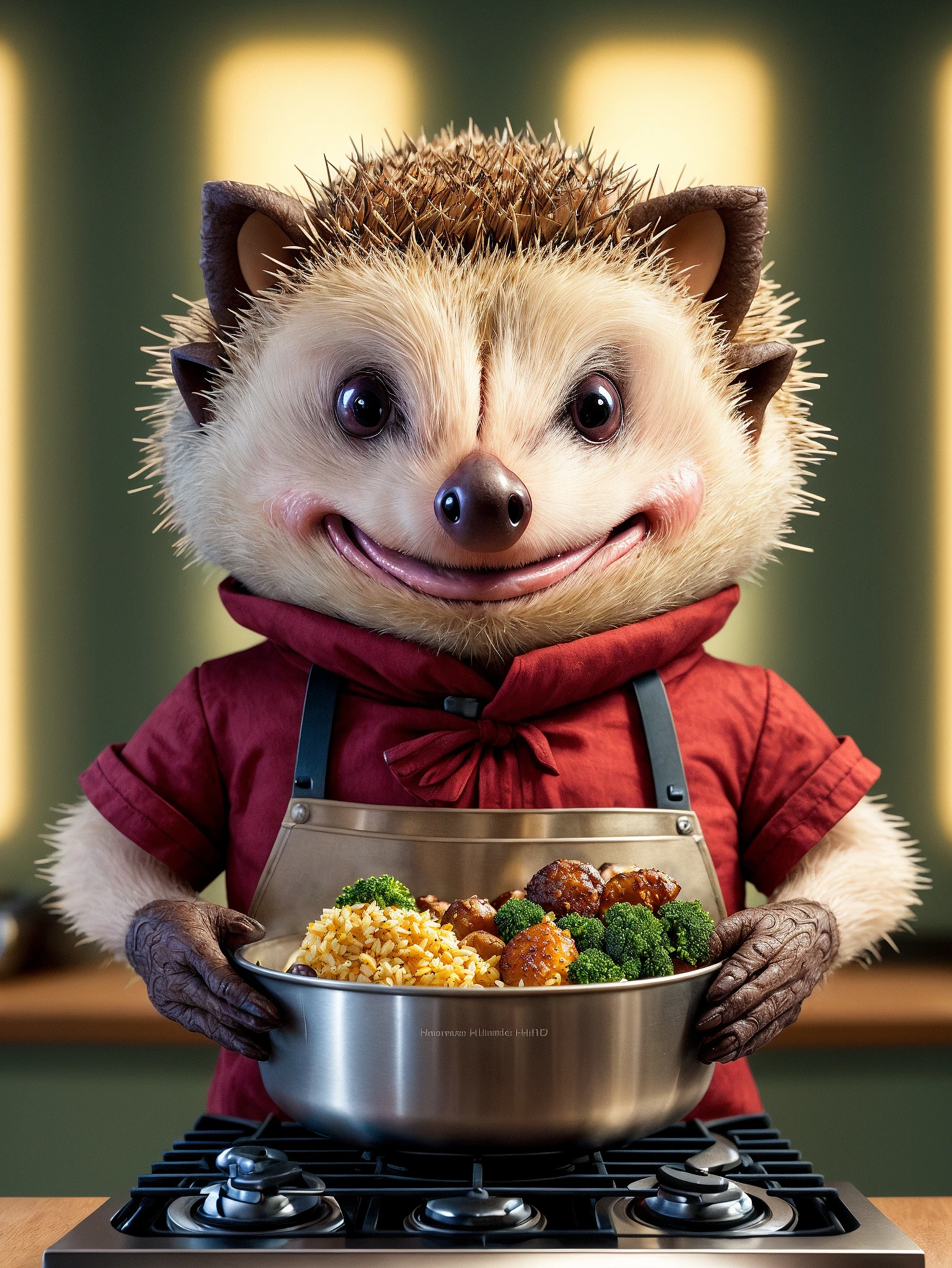 anthropomorphic hedgehog cooking in the kitchen, lightroom, cinematic, hdr, raw, intricate, high quality, soothing tones, intricate details, low contrast