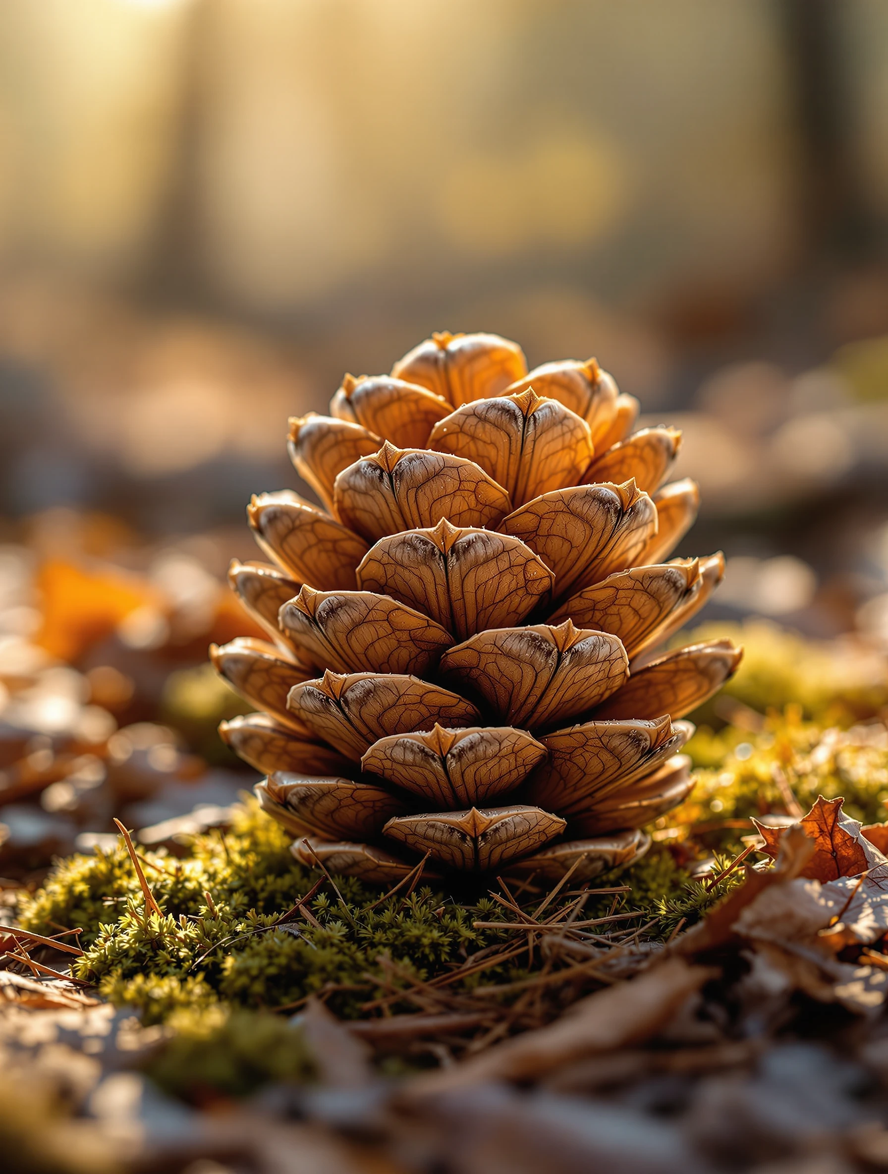 A breathtaking **ultra-high-definition macro photograph**, capturing the **intricate textures and natural symmetry** of a **freshly fallen pine cone** nestled on the **forest floor**. The camera lens focuses sharply on the **overlapping woody scales**, revealing every **fine detail—each ridge, crack, and subtle curve**, shaped by **time and nature**. The **pine cone’s surface** exhibits a **rich blend of deep brown hues**, with hints of **warm amber and golden highlights**, showcasing its **organic structure**. Tiny specks of **resin cling to the edges**, glistening in the soft, filtered sunlight streaming through the **forest canopy above**. The **shallow depth of field** creates a **dreamlike, blurred background**, composed of **dried leaves, scattered pine needles, and soft moss**, painted in **earthy browns, muted greens, and golden undertones**. The scene is enhanced by a **gentle bokeh effect**, where the **diffused natural light** adds depth, warmth, and a tranquil atmosphere. The **composition adheres to the rule of thirds**, with the **pine cone slightly off-center**, emphasizing the **interplay of light and shadow** across its rugged texture. The **soft directional sunlight** illuminates the **fine details of each individual scale**, bringing out a sense of warmth and natural elegance. Tiny **dewdrops or specks of dust in the crevices** add an extra layer of **realism and authenticity**, making the image feel **hyperrealistic and tangible**. This **serene, photorealistic macro shot** captures the **quiet beauty of the natural world**, evoking a **fleeting moment in the forest’s daily cycle**. The image is **stunningly detailed**, with a **hyper-sharp focus**, making every minute **detail crisp and vividly defined**, as if one could **reach out and touch the delicate organic surface** of the pine cone. Rendered in **8K ultra-high resolution**, with **masterful depth of field, perfect natural lighting, and a cinematic sense of detail**, this image embodies the **essence of nature’s intricate beauty**.