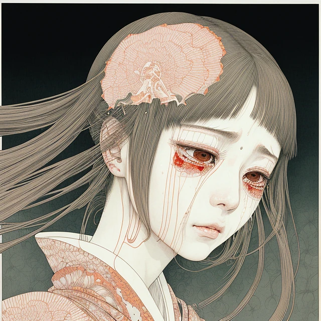 Woman crying, artwork by Takato Yamamoto and Chika Yamada, very detailed, realistic, hyperrealistic, detailed futuristic background