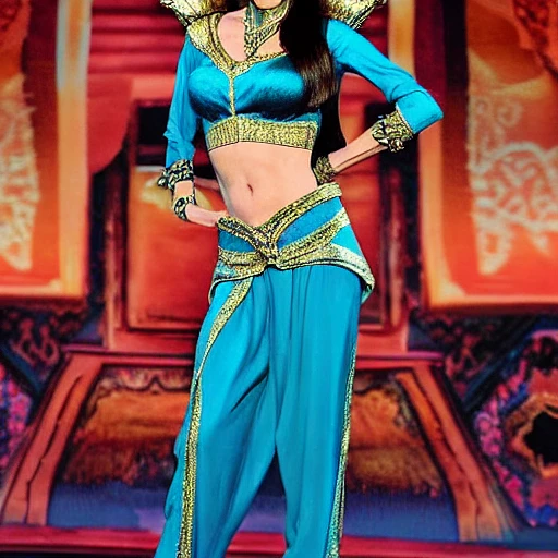 Angelina Jolie plays Jasmine in Aladdin, and her full body photo shows her signature turquoise pants and a nine piece top. Her position is slightly below the line of sight, giving her a strong and confident appearance, with the right side off center and the left side having an open space, creating a sense of openness and freedom. The lighting is soft and diffuse, with bright and vibrant colors, moderate contrast, and complex patterns. The shallow depth of field blurs the background, while the slightly tilted upward angle increases the sense of height and power. Emotionally confident and powerful, with a film and modern style that emphasizes camera details. The background is the city of Agraba, with a slight fading effect, slightly unsaturated color, and increased contrast, giving a slightly retro and nostalgic feeling. The texture is well captured, Nikon D850 and 24-70mm f/2. 8 lenses for shooting, 1/125 second, f/5. 6,ISO 200。