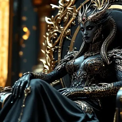 A very beautiful queen sitting on a black throne made of gold, with a serpent-dragon like elements and design, intricate details, dramatic lighting, hyperrealism, photorealistic, cinematic, 8k, unreal engine --ar 9:16 --niji 5 --style expressive --s 180
