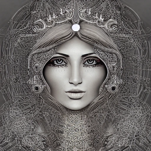 redshift style, a real perfect female body of a beautiful zoroastrian witch:: long Hair that dissolves with the universe, sacred geometry, perfect face, beautiful detailed eyes, crown with zoroastrian Patterns, sacred geometry , sacred symbols, thelema, astrum argentum, intricate, elegant, highly detailed, muted colours, trending on artstation, by Tom Bagshaw and Seb McKinnon, full body, photography, epic cinematic, octane render , denoise, photograph with a Hasselblad H3DII, extremely detailed