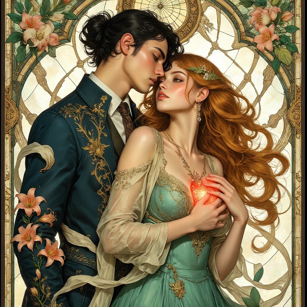 Intricate Art Nouveau tableau in the style of Alphonse Mucha::1. 6 A stylized couple connected by a glowing crimson heartstring::1. 5 He embraces her from behind, their chests aligned, the heartstring a luminous ribbon pulsing with life::1. 6 Her flowing auburn hair cascades in sinuous golden lines, his dark curls entwined with ornate floral and vine motifs::1. 4 She wears a diaphanous jade-green gown, he dons a tailored midnight-blue coat with gilded embroidery::1. 3 Background of swirling lilies, peacock feathers, and stained-glass window patterns::1. 2 Dynamic diagonal composition with swirling drapery and geometric frames::1. 4 Soft pastel palette of emerald, rose, and amber accented with gold-leaf highlights::1. 3 Delicate linework and ornamental borders, volumetric light filtering through colored glass::1. 3