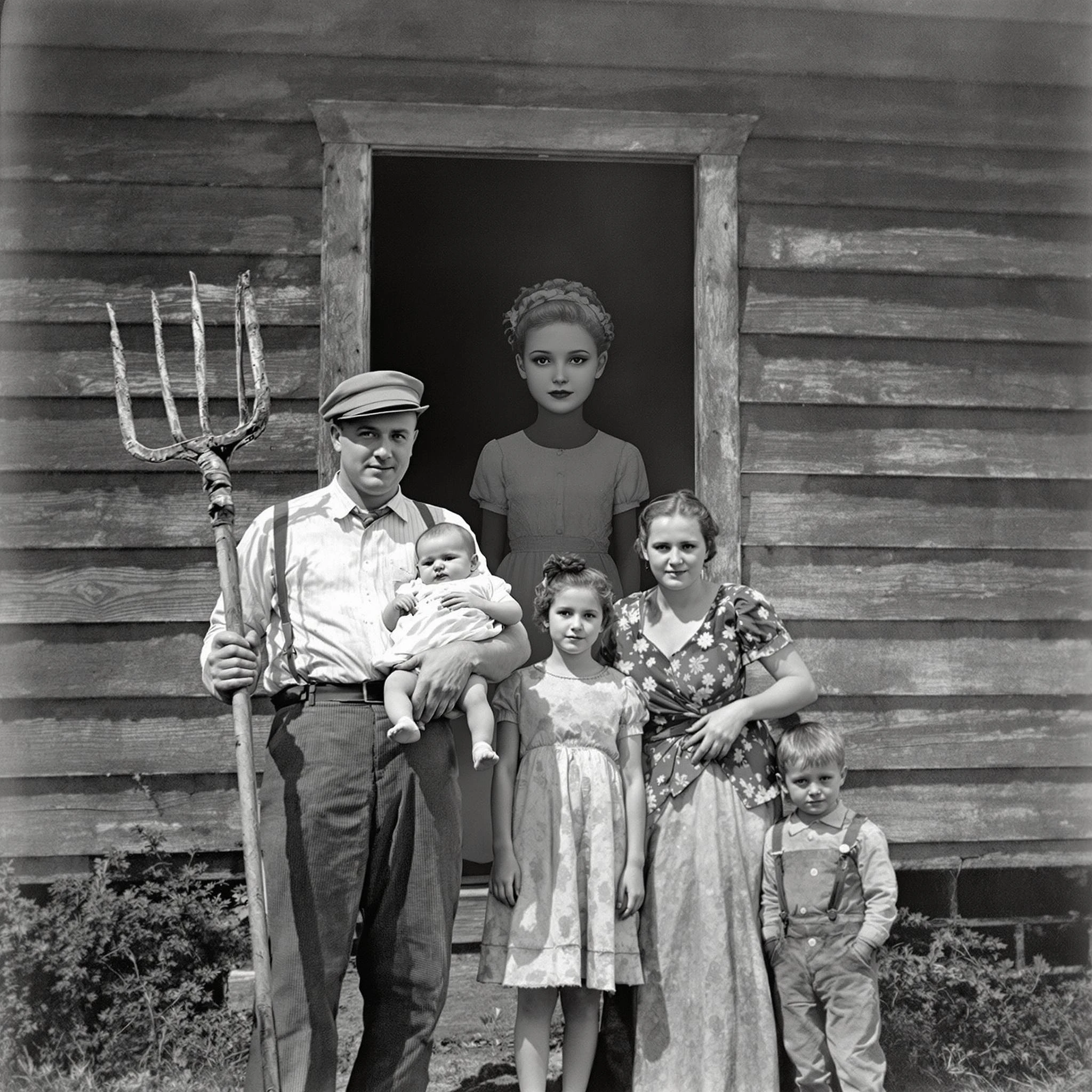 "A hyper-realistic black-and-white photograph from the 1920s, featuring a small family standing outside their farmhouse. The father holds a pitchfork, the mother cradles an infant, and two children stand by their sides. The details of their clothes and expressions are historically accurate, showing worn fabric and tired eyes. However, just behind the family, faint but unnerving, a transparent figure of a young girl is visible, blending with the wooden slats of the house, her empty gaze staring directly at the camera