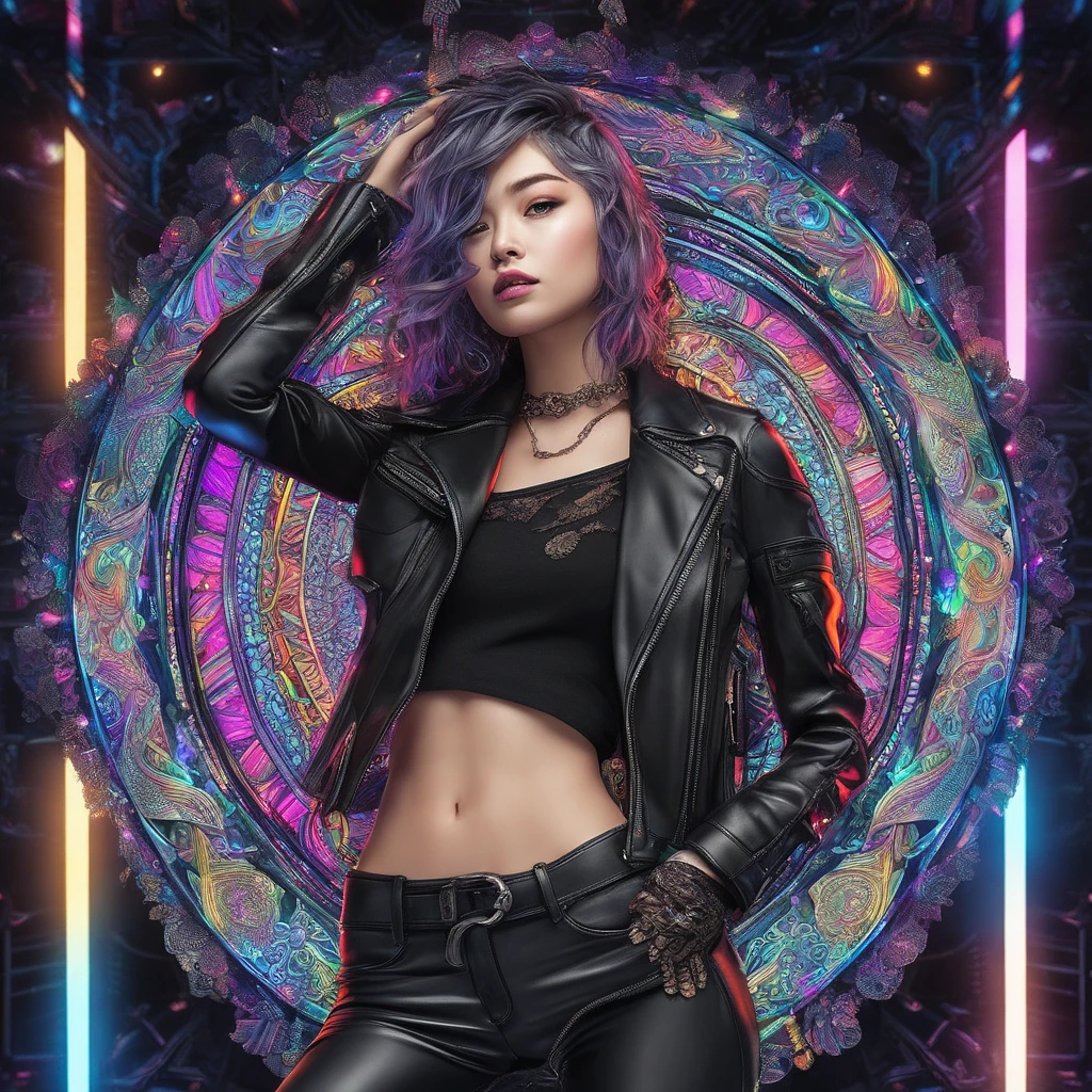 official art, unity 8k wallpaper, ultra detailed, beautiful and aesthetic, masterpiece, best quality, (zentangle, mandala, tangle, entangle) , 1girl, extremely detailed, dynamic angle, elegant, atmospheric, ecstasy of life, mechanical arm, neon lights, (black leather pants) , (black leather jacket:1. 3) , midriff, l, (short messy blue hair:1. 6) , <lora:SBGF:0. 9> <lora:add_detail:1> <lora:epiNoiseoffset_v2Pynoise:3> , sharp focus, emitting diodes, smoke, artillery, sparks, racks, system unit, motherboard, by pascal blanche rutkowski repin artstation hyperrealism painting concept art of detailed character design matte painting, 4 k resolution blade runner