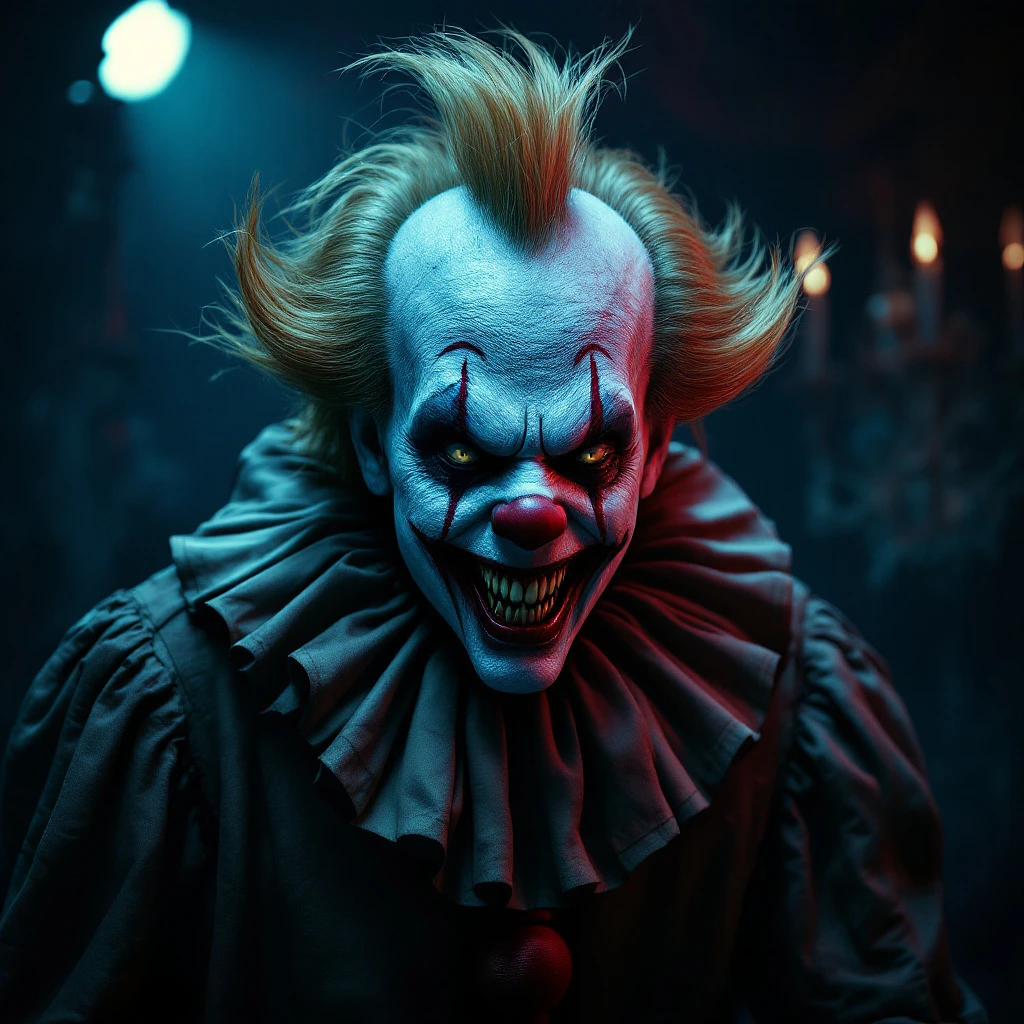 A midget scary clown that looks like donald trump with donald trump hair and a menacing grin in a dark grotesque circus show, dark circus show, horror, dark, intricate design and details, dramatic lighting, photorealistic, cinematic, cinematic noise, 8k --ar 9:16 --v 5