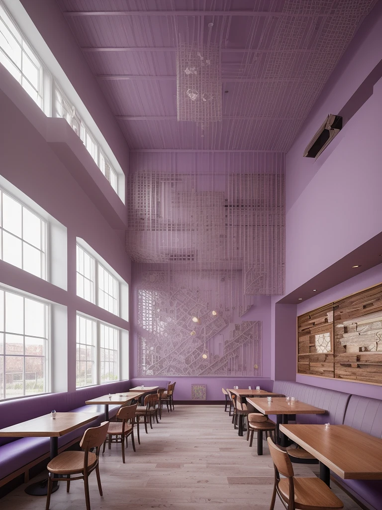 High resolution photography interior design, restaurant, modern furniture and decoration, high ceiling, purple pastel palette, interior design magazine, cozy atmosphere; 8k, intricate detail, photorealistic, realistic light, wide angle, kinkfolk photography, A+D architecture