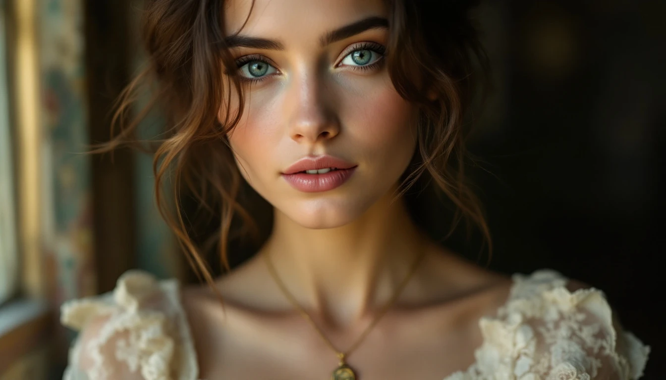 "lighting is soft and flattering, casting gentle shadows that add depth to her expression. She wears a delicate, vintage lace dress in a pale cream hue, adorned with intricate floral patterns that complement her ethereal aura. A gentle breeze tousles her hair, adding a touch of movement to the image. Around her neck is a thin, gold chain with a small antique locket, hinting at a story untold. Her serene expression exudes a sense of mystery and timeless beauty, inviting viewers to ponder the secrets behind her captivating gaze. "