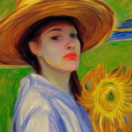 impressionist painting, realistic face of woman, sunflower hat, texture, 4k, detail focused, extreme details, Edvard Munch
