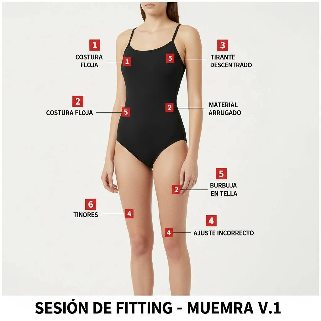 créame una imagen de un bañador de mujer que represente una prueba de una muestra física de ese bañador sobre el cuerpo de una modelo como si estuviera realizándose una sesión de fitting. la imagen debe de indicar mediante unas flags numeradas a modo de leyendas, zonas del bañador como simulando donde hay defectos en costura o en el posicionado de los materiales, . el objetivo es que esa imagen fuera algo que explicara a un proveedor puntos a mejorar en la muestras. la imagen debe de ser para un portal de eccomerce por lo que debe de ser una imagen de un producto con fondo blanco y sin maniqui