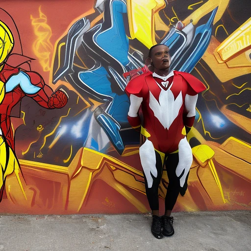 a blackman in a red and yellow superhero suit fighting a white man in a dog superhero suit, in front of a graffiti wall