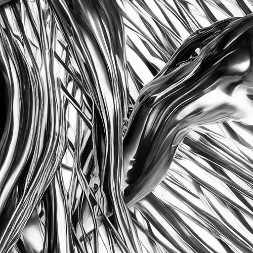 a 3D realistic color photo, a woman made of black chrome screams in horror, ripping through the crowd with raw anguish, sinister variation deep ebony hue merges with a subtle metallic sheen, her form sculpted from the depths of black chrome. stands smooth and statuesque, imperfectly crafted curves, black chrome, eyes like pools of liquid obsidian, ( a statue by by Aleksander Gierymski, featured on cgsociety, hr giger ) (( stained glass, 2 0 2 1 cinematic 8k framegrab) ( hyperrealistic photo luis royo, horror, fantasy horror, rain, temple made of flesh, wrapped in wires and piones, steel barbs, razors, octane, disfigured, deformed, mutated, ) --ar 3:2