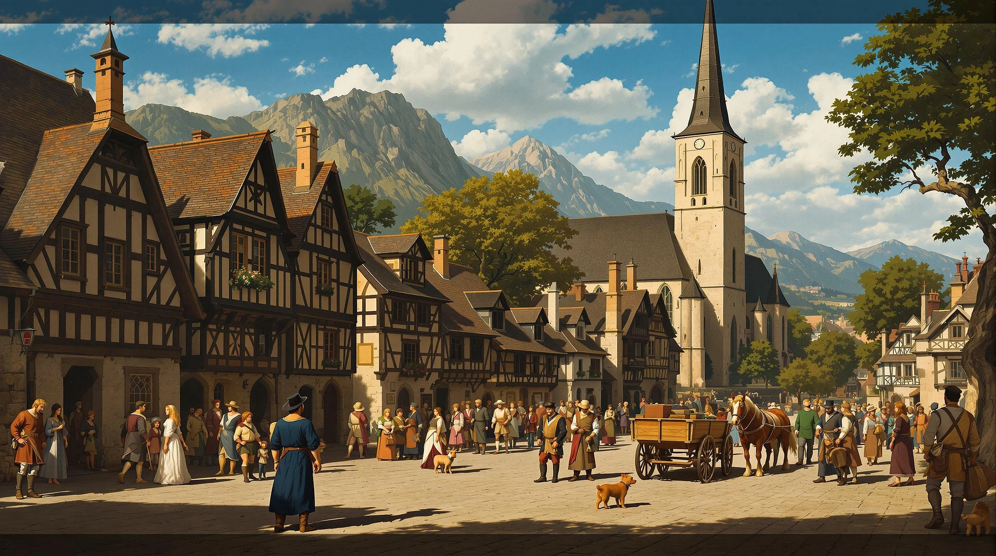 a medieval village scene, showcasing a bustling street with people and animals going about their daily business. A man in a blue tunic and black hat stands in the foreground, accompanied by a woman in a white dress and a dog. A group of people in various attire, including tunics, dresses, and hats, are scattered throughout the street. A horse-drawn cart is visible in the background, with a man standing beside it. The buildings are made of stone and have steeply pitched roofs, with half-timbering on some of the structures. A large church with a tall steeple dominates the background, surrounded by smaller buildings and trees. The background features a mountain range with a blue sky and white clouds. The lighting is bright and sunny, with long shadows cast by the buildings and people. The overall style is reminiscent of a Renaissance-era painting, with intricate details and textures.