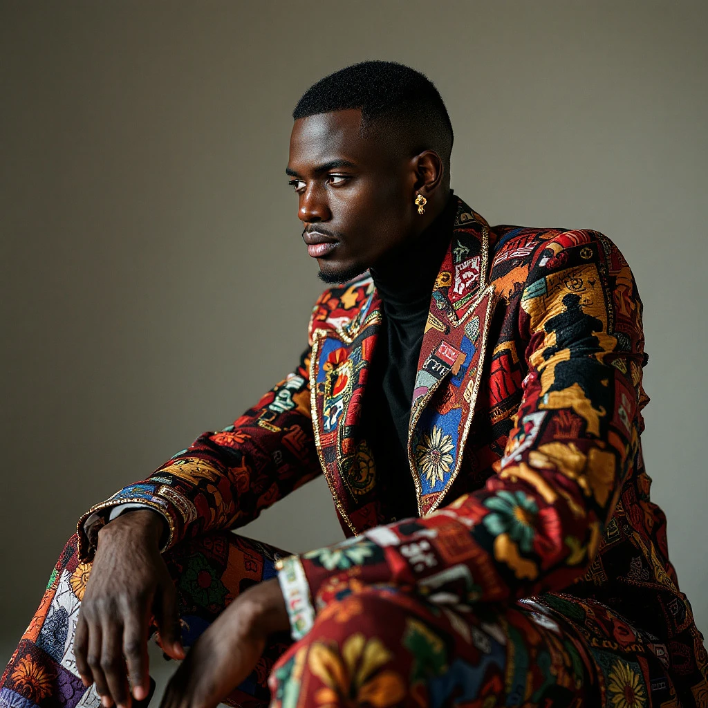 fashion shoot african american male model earing dolce and gabbana patchwork suit