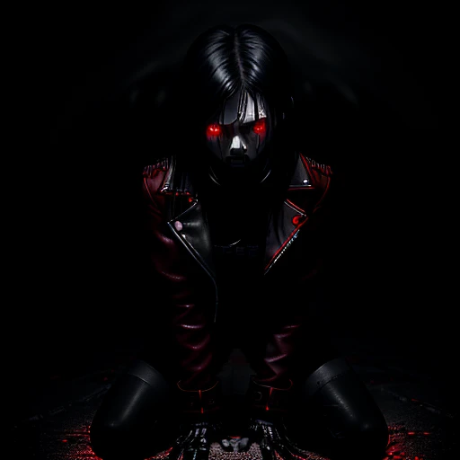 alone in the darkness, broken, kneeling and looking down, full body, no face, (psychopathic:0.8) , brutal composition, gloomy, intense dark tones, leaving an indelible and haunting impression on psyche, emo girl, red leather jacket with black trim. glowing red iris, blak black hair with red highlights,