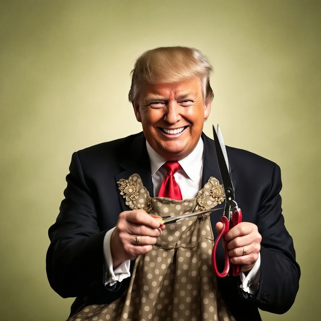 Photo of a smiling Donald Trump wearing a 50s housewife-dress and using a grape scissor having fun!