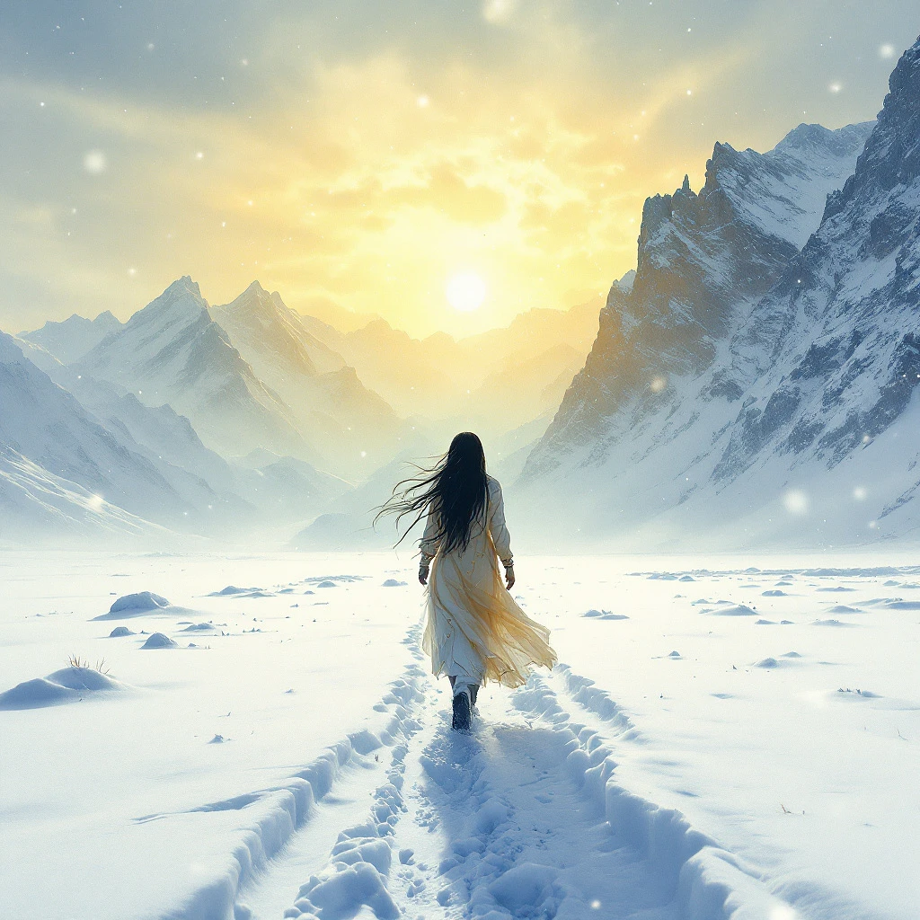 a woman with long hair walking through a frozen landscape with snow fall in flat plain, in the style of cinematic montages, dragon art, franciszek starowieyski, yellow and white, john howe, hyper-realistic details, himalayan art