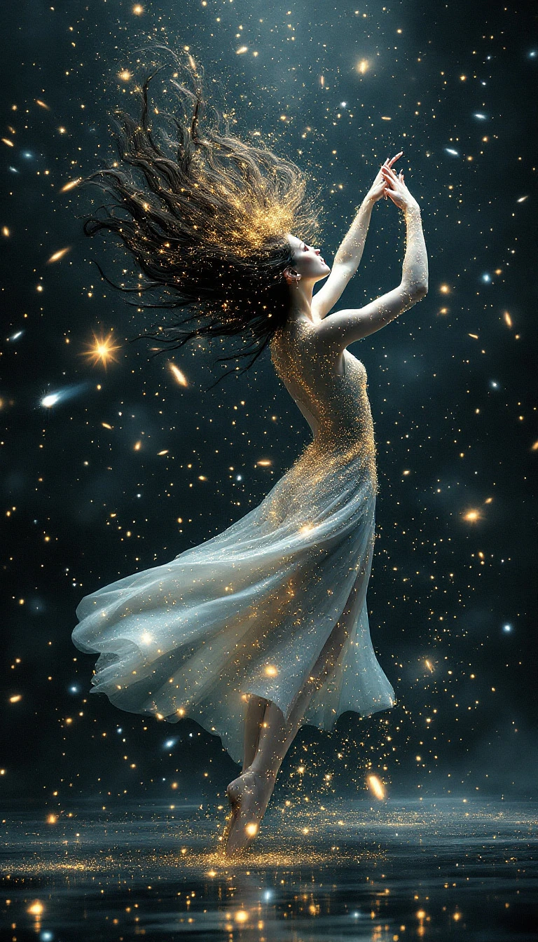 1. A breathtaking, full-body scene of a woman dancing amidst a shower of falling meteorites, her form flickering like a firefly against the cosmic backdrop. She wears a flowing dress woven from captured starlight, and her hair is a cascade of cometary tails. The style blends the dynamic movement of ballet with the awe-inspiring vastness of space, creating an image of raw, celestial beauty.