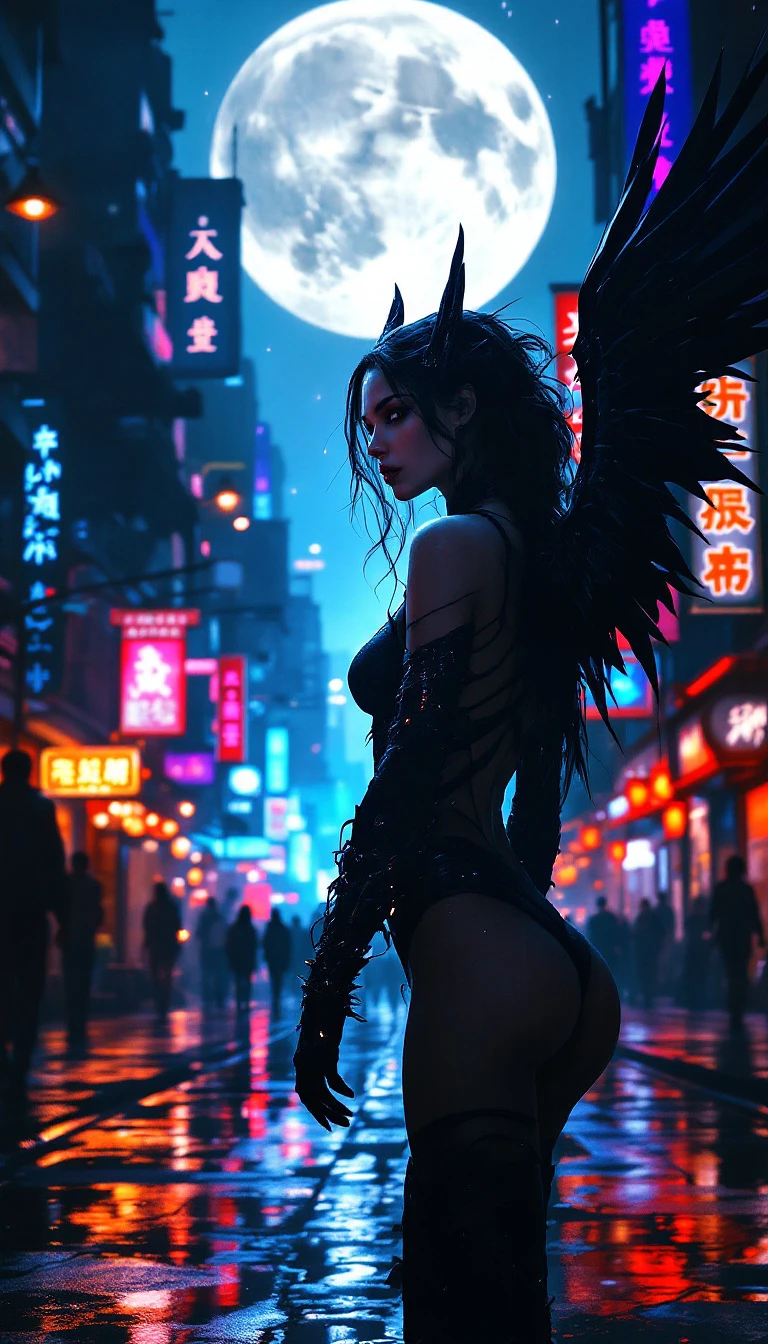 epic fantasy character art, woman in a black outfit with wings, city street at night, illuminated by a full moon, bustling atmosphere, futuristic elements, neon lights reflecting off the wet pavement, dramatic shadows, cyberpunk influence, ultra-detailed, vibrant coloration, hauntingly beautiful ambiance, showcasing a merging of fantasy and urban aesthetics, high-quality 4K.