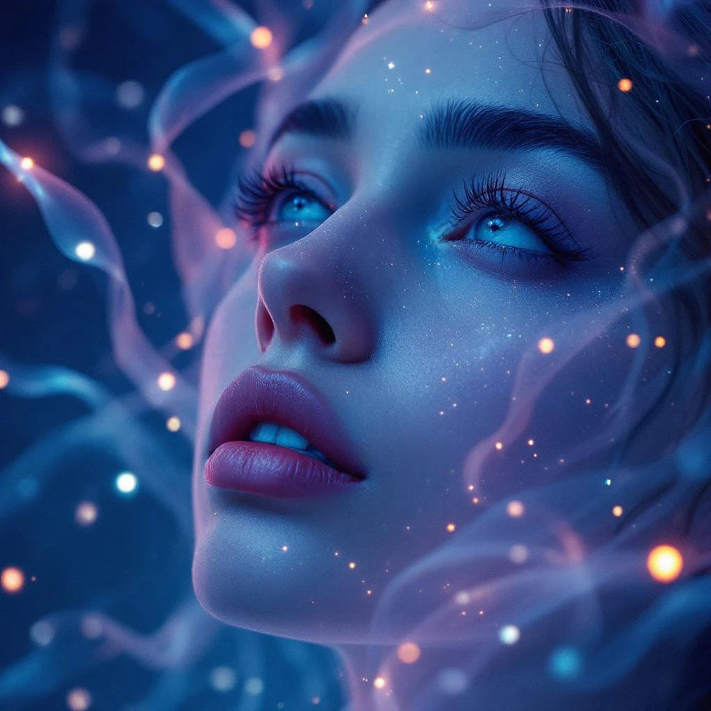 Close-up of a serene, expressive face with dreamy eyes looking into the distance, surrounded by glowing ribbons of light and soft cosmic nebulae in deep night blue and gentle magenta hues, ethereal and transcendent atmosphere, subtle stars reflecting in the eyes, emotional and intimate portrait, minimalistic background --v 5 --q 2 --ar 1:1