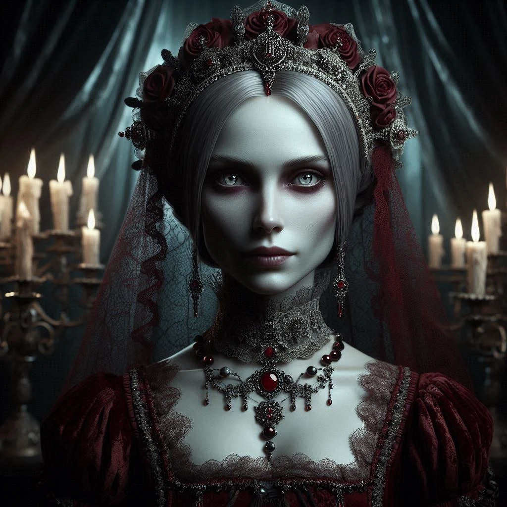 an ultra-realistic, legendary portrait of Elizabeth Bathory, "The Blood Countess, " highlighting her cold, enigmatic beauty and ominous presence. She stands in a dimly lit, opulent chamber adorned with dark velvet drapes and flickering candelabras casting eerie shadows. Her pale skin contrasts with a lavish, blood-red gown adorned with intricate lace and jewels. Capture her piercing eyes and a faint, sinister smile, emphasizing the textures and details of her attire and surroundings. Use photorealistic texturing, high contrast lighting, and meticulous detailing to evoke the chilling elegance and legendary status of this historic figure.