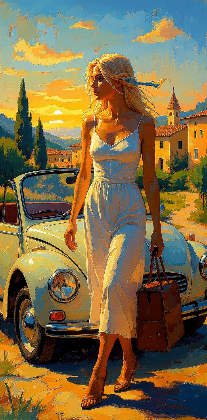 portrait of a long blonde hair woman, in the style of Greg Hildebrandt, provance landscapes, a woman getting out of an old Citroën Cabrio, arrive in Provence, France , wearing light summer dress, and scarf in her hair, holding a small luggage in her hand, background is a little village, spray painted realism, hard-edge painting --chaos 75 --ar 1:2 --style raw --profile rsy6uq9 --stylize 750 --v 6. 1