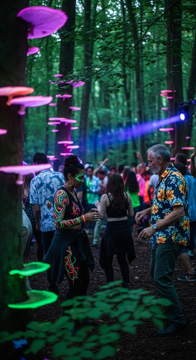 Describe a party taking place deep in a forest, featuring four Void Acoustics speakers arranged to create an immersive sound environment. Include vivid details about the crowd, lighting design, music styles, and how the natural forest setting influences the overall atmosphere