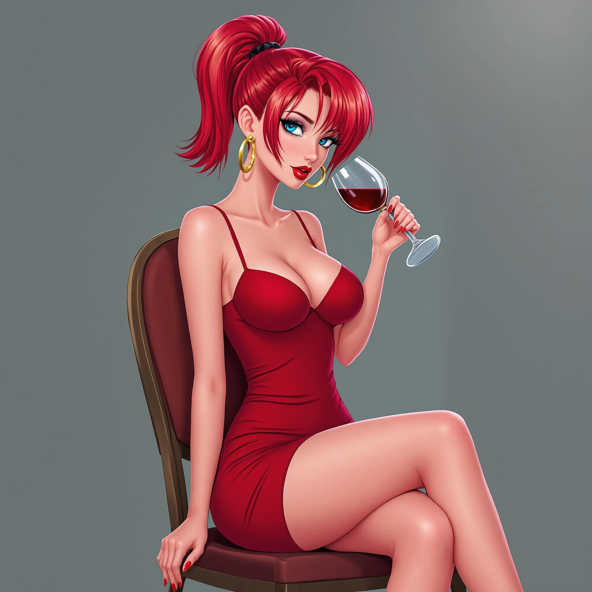 anime, woman, red hair, short ponytail, cyan eyes, red lips, red bodycon dress, tight dress, red high heels, golden sterling hoop earrings, bare legs, closed cleavage, big chest, bare arms, with straps, sitting on a chair, legs crossed, drinking wine