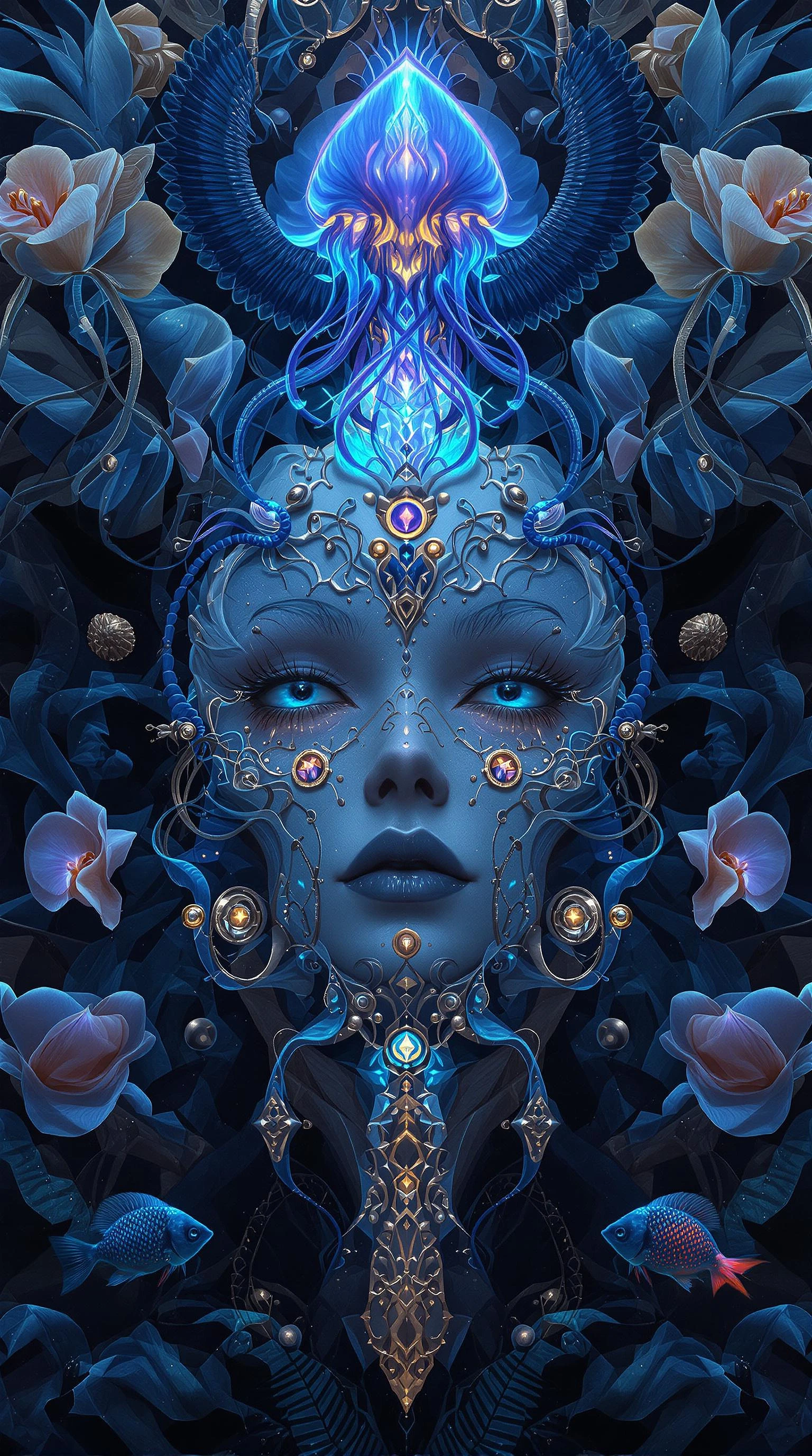 Goddess close-up portrait ribcagel. jellyfish phoenix head, nautilus, orchid, skull, betta fish, bioluminiscent creatures, intricate artwork . octane render, trending on artstation, t symmetrical artwork. cinematic, hyper realism, high detail, octane render, 8k