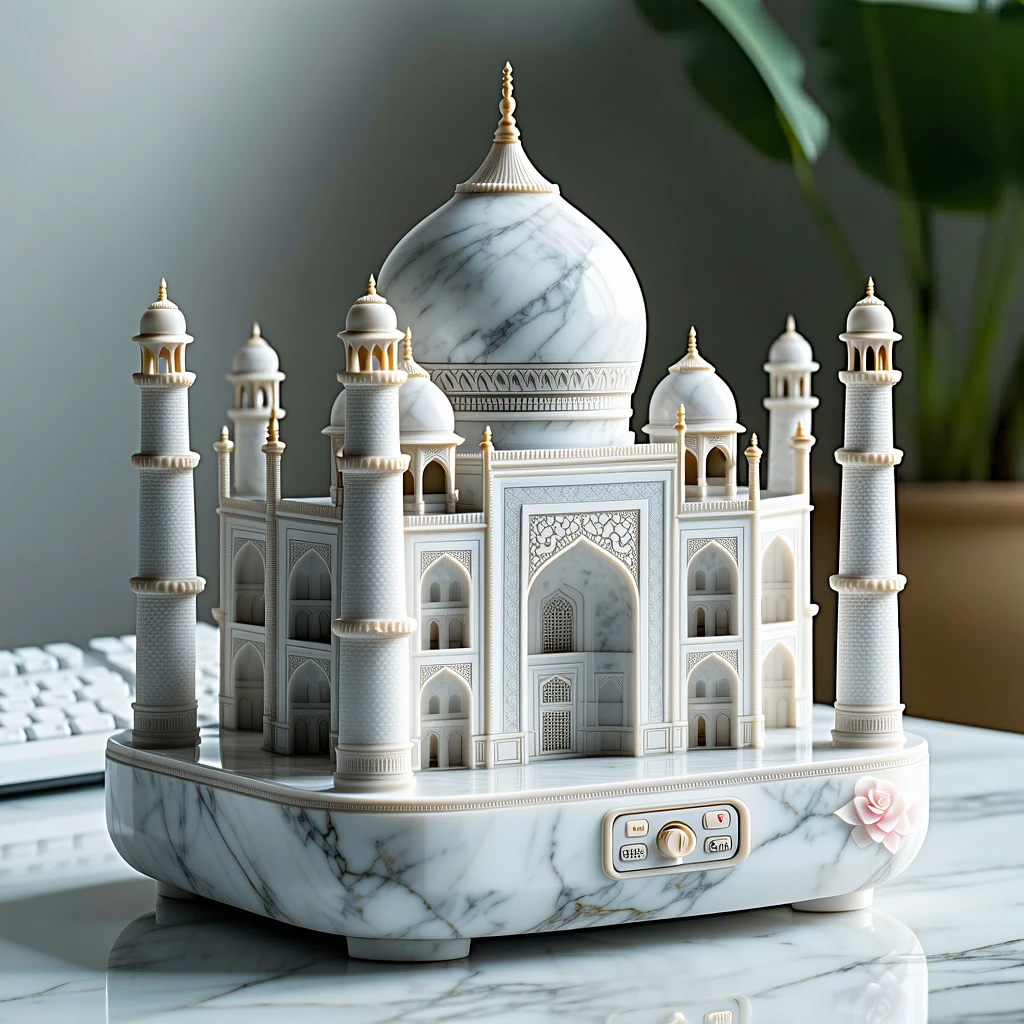 Aroma diffuser, inspired by the intricate, ornate designs of the Taj Mahal, with a marble exterior and intricate floral engravings, detailed, in style of artstation, digital art, hyper detailed, hyper realistic, white background, unreal engine, png 8K, depth of field, --ar 1:1
