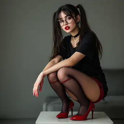 Full body photograph of a blonde woman with slightly-wavy hair, long well-defined eyelashes, bold eyeliner, poses seductively in a modern study. She wears a tight, black v-neck t-shirt, revealing her toned figure, and skin-tight silvery high-waist leggings with black high-heeled ankle boots. She leans against a minimalist wooden desk, one hand resting on the surface while the other is elegantly placed on her thigh. Her facial expression is confident and alluring, lips slightly parted, and she gazes directly into the camera. The lighting is soft and natural, highlighting the texture of her hair and the contours of her body. The focus is sharp on the subject, with a slightly blurred background for a professional depth-of-field effect.