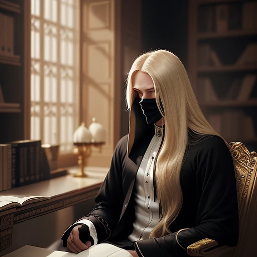A young man in his 20s with a moderate build and long blonde hair, wearing a white mask that hides his face, sits at a desk inside a dimly lit room decorated with the decor of a noble palace. He wears a long-sleeved black shirt. The room features beautiful and elegant walls, with a window and books behind him. The young man focuses intently on manipulating the strings of a set of dolls. The overall scene evokes a sense of mystery, intrigue, and manipulation.