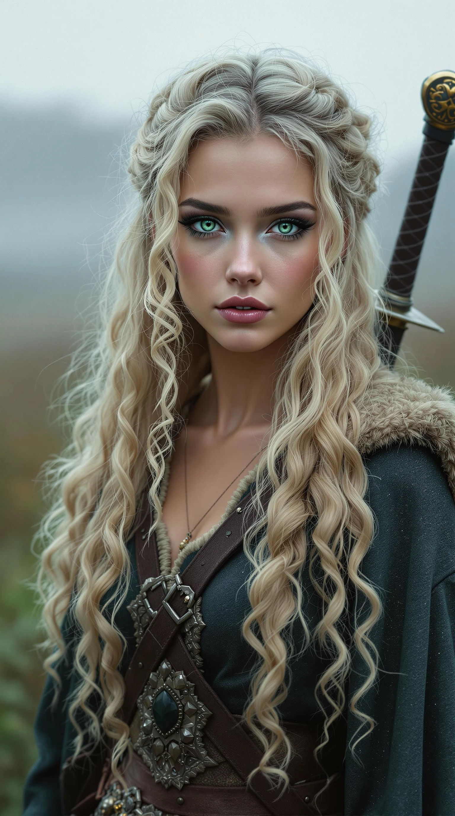 a professional photo of a exceptionally of the most beautiful Scottish girl in the world, (age 18) , (futuristic) , (masterpiece) , (realistic) , (perfect anatomy) , flawless skin, large beautiful brilliant Forest Tea green-blue-pink-silver-brown-golden eyes, green eye liner, light pink blush, dark green eye shadow, small dimples in cheeks, extremely long curly blonde, (dressed as a Scottish warrior) standing in a foggy field, Rapier sword, strapped to her back, (8k) , (high res) , ultra-detailed, photo-realistic, front view, highly detailed, volumetric, dramatic light Perfect graphics, ultra-detailed, photo-realistic, full image view, full body view, front view