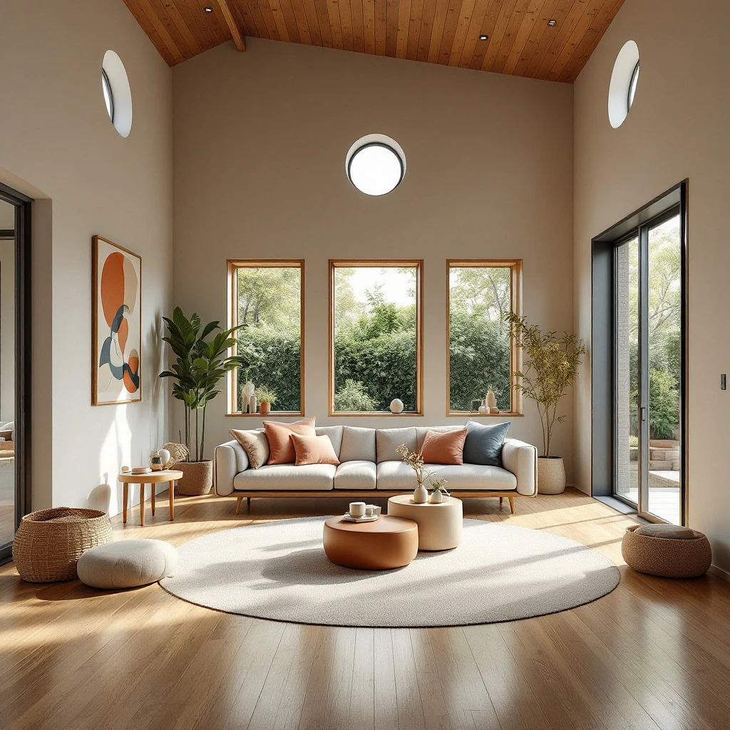 High resolution photography interior design, dreamy sunken living room conversation pit, wooden floor, small windows opening onto the garden, bauhaus furniture and decoration, high ceiling, beige blue salmon pastel palette, interior design magazine, cozy atmosphere; 8k, intricate detail, photorealistic, realistic light, wide angle, kinkfolk photography, A+D architecture