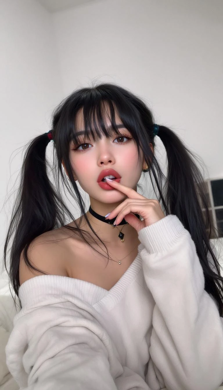 A photo of an Asian girl with long black hair, bangs, and twin tails, wearing a choker necklace, in a cozy white room, posted on Snapchat, posing while touching her lips to the camera --ar 69:112 --stylize 750 --v 6. 1