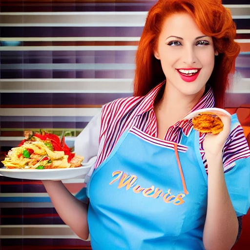 waitress serving food in a 80's looking diner, hyper realistic, photo realistic, high resolution, studio photoshoot, depth of field --v5