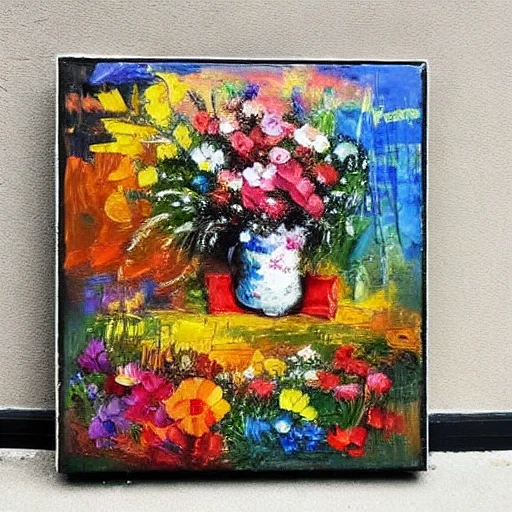 high detailed oil painting, thick texture, pallet knife, bright colourful, big face surrounded by flowers