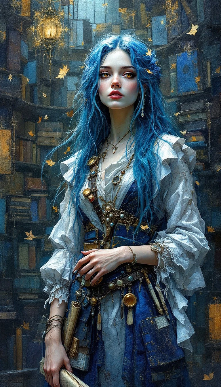 "Lapis Lorekeeper in a Whispering Library": A compelling abstract painting presents a lorekeeper, with a blend of wisdom and a profound love for the stories of the world. She is a skilled keeper of knowledge, shown within an ancient library where the books seem to whisper and move on their own, with a pale complexion, long, flowing lapis-blue hair, styled in an intricate and detailed way, and a layered, comfortable outfit often adorned with book pages and quill pens. Various books, scrolls and other items of learning are attached to her belt and are held within her hands. The artwork blends modern and abstract techniques with a figure representation, creating a unique and captivating scene that utilizes tones of blues, whites and golds. Her wise, amber eyes, the focal point of the composition, convey a sharp intellect and a deep love of stories and knowledge. After a night spent delving into ancient texts, the lorekeeper embodies both understanding and an enduring love for the power of words. The subtle textures and soft lighting invite the viewer to explore the hidden narratives within this vibrant artwork, designed as a painting.