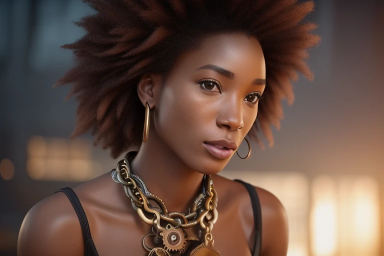 High detail RAW color photo professional nude close photograph of a female warrior (( woman standing) ), in a ((steampunk city) ), ((night) ), sexy look, steampunk necklace, skin pores, sexual, matte, pastel colors, backlighting, depth of field, natural lighting, hard focus, film grain, (3d) , ray traced, rendered