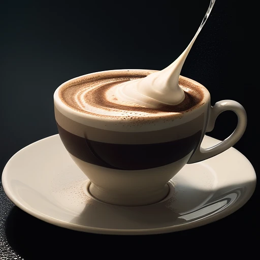The image captures a splash of coffee and cream inside a cup. . The suspended droplets and the smooth interplay of light and dark hues create a visually striking scene that portrays the elegant flow and contrast between the two liquids.