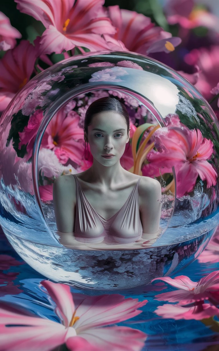 woman in a glass ball with flowers in it| hyperrealistic| photorealistic| sharp focus| 4k