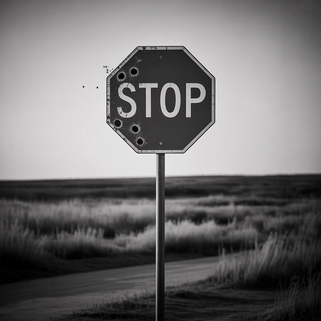 a hauntingly beautiful image of a bullet-ridden stop sign set against a stark landscape. This monochrome photograph captures themes of isolation danger, inviting viewers to ponder the relationship between safety risk in abandoned environments.
