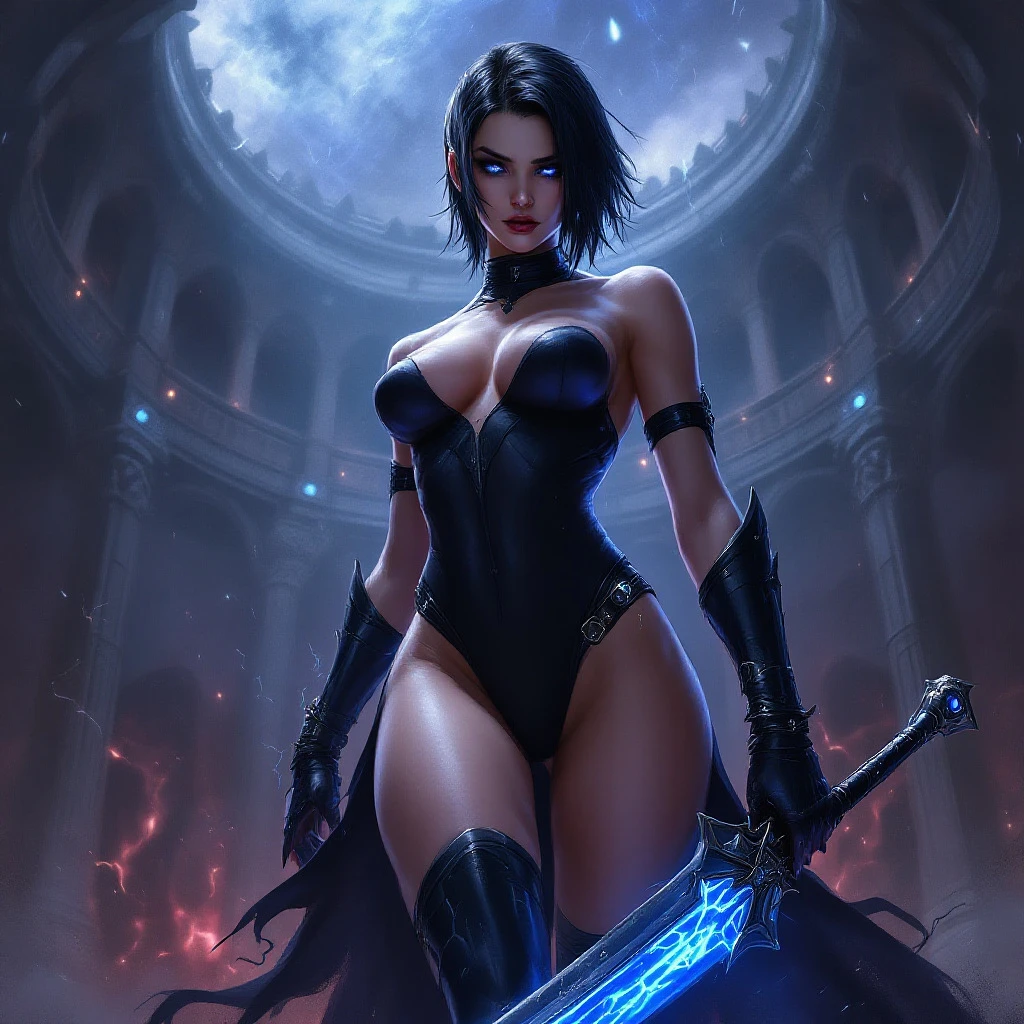 digital painting in the style of warhammer 40k of a female comissar, standing infront a gothic circh, holding a sabre with blue lightning, cybereyes, black ultra tight onepiece bathsuit, black sidecut hair, huge dd tits