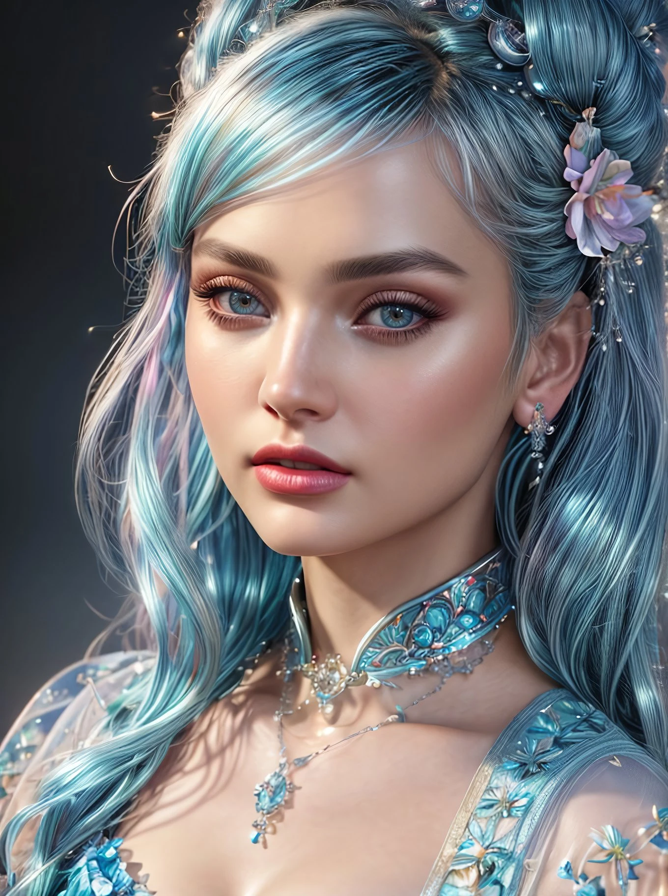 An extremely gorgeous woman, with top knots full of cyan jewelers, delicate intricate iridescent details, red lipstick, global illumination, hyper-detailed, ultra-detailed 3d, a Pixar and Disney character art by Artgerm, hyper-detailed face, clear realistic eyes, sharp focus, octane render, ray tracing, Ultra-High-Definition, 8k, UHD, HDR, (Masterpiece:1. 5) , (best quality:1. 5)