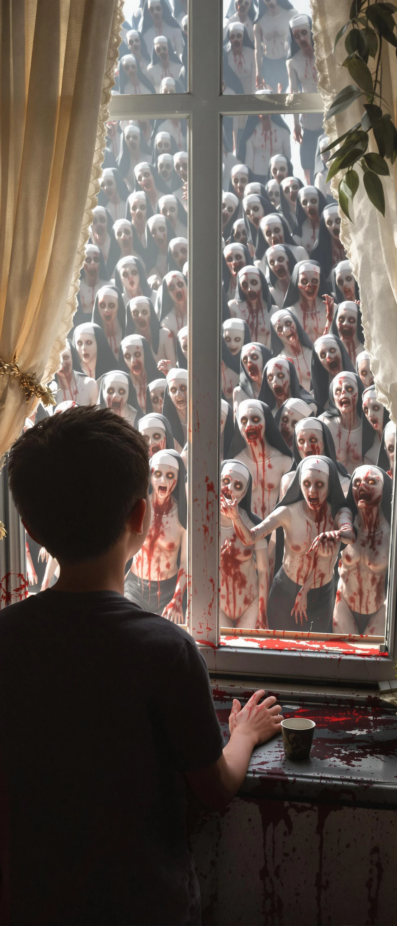 A boy looking from a window at daylight and sees many walking womem zombies . Their body are exposed and covered with blood . Many nuns zombies . Hyperrealistic. Hyper details . Hyper face and body details . 8k . High quality .