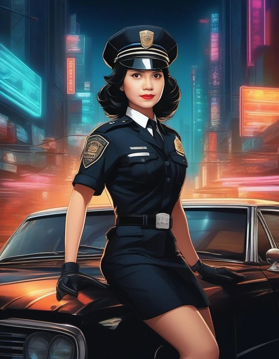 A captivating and highly detailed 1960s pinup-inspired anime scene featuring a attractive highway patrol officer. The character is dressed in a stylish and intricate uniform, complete with a hat and gloves. She stands confidently with one hand on her hip and the other holding a shiny, vintage police badge. The background is a spectacularly rendered, ultra-detailed matte painting of a bustling highway with neon signs and retro-futuristic buildings, creating a dynamic sense of depth and atmosphere. The final quality font is bold and eye-catching, adding to the overall high-octane and glamorous feel of the image. , painting, poster, photo, anime